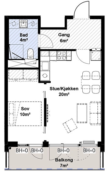 Vanlig netto etasjehøyde i leilighetene blir ca. 2,5 meter. Deler av himlingen vil bli nedsenket med en takhøyde på minimum 2,2 meter pga. tekniske føringer. Dette er typisk i gang, bad og bod. Over kjøkkenskap vil det være en innkassing for ventilasjonskanalen for avtrekksvifte.