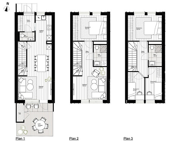 Flott rekkehus over tre plan med en åpen stue- og kjøkkenløsning, to bad i