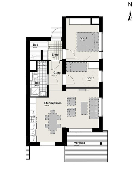 3-romsleilighet med åpen stue-/kjøkkenløsning, to soverom og intern bod. Parkeringsplass og sportsbod i p-kjeller.