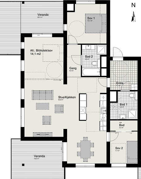Toppleiligheten inneholder, entre, 2 bad, 2 soverom, bod og åpen stue/kjøkkenløsning. Parkeringsplass og sportsbod i p-kjeller.