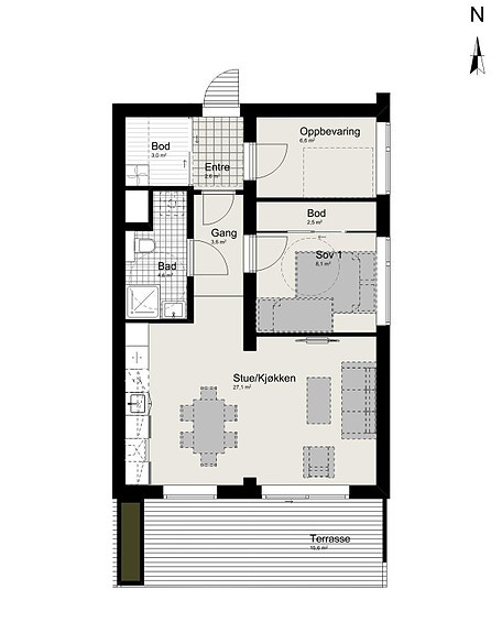 2-romsleilighet med åpen stue-/kjøkkenløsning, ett soverom og intern bod. Parkeringsplass og sportsbod i p-kjeller.