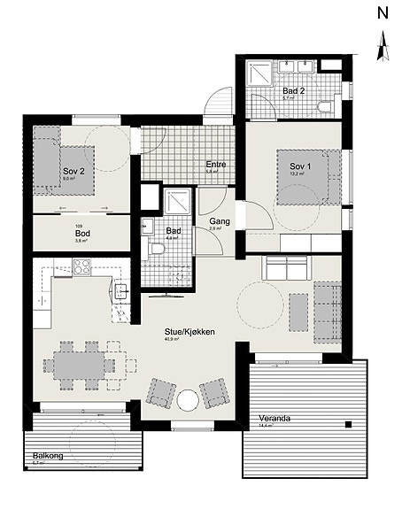 Toppleiligheten inneholder, entre, 2 bad, 2 soverom, bod og åpen stue kjøkkenløsning. Parkeringsplass og sportsbod i p-kjeller.