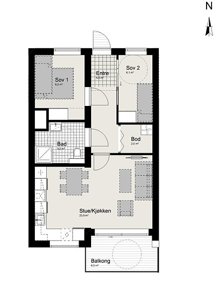 Leiligheten inneholder, entre, bad, 2 soverom, bod og åpen stue kjøkkenløsning. Parkeringsplass og sportsbod i p-kjeller.