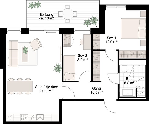 Lys og stor 3-roms leilighet med god planløsning. Praktisk åpen kjøkkenløsning mot romslig oppholdsrom, og god plass til både sofa- og spisegruppe. Fra stue har du skyvedør ut til stor balkong. To fine soverom hvorav hovedsoverom har rikelig plass til garderobe. Stor gang med god plass til garderobe. Delikat flisbelagt bad med plass til vaskemaskin.