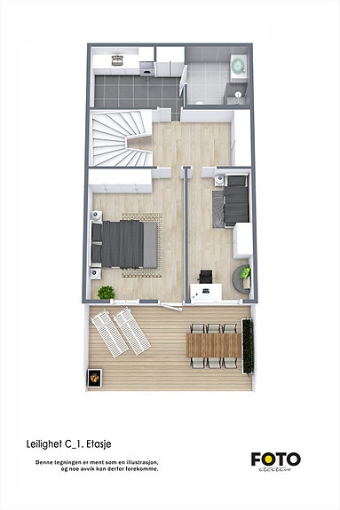2. etasje: Entré, bod, bad, soverom og stue/kjøkken. Utgang til balkong