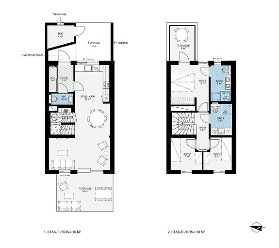 Fine, private uteplasser er vektlagt, og rekkehusene får god standard med enstavs overflatebehandlet herdet tregulv, bad flislagt med store, lyse fliser og praktiske kjøkken med innredning fra HTH.