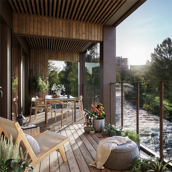 Romslig og attraktiv 3-roms leilighet med god standard, ekstra takhøyde og en fin beliggenhet på hjørnet mot parken utenfor Biblioteket. Leiligheten ligger i en høy 2. etasje (første boligetasje mot elvepromenaden) og har nydelig utsyn mot grøntområder og en spesiell nærhet til elva – perfekt for både ro og rekreasjon. Store vindusflater gir svært godt lysinnslipp og en åpen, luftig romfølelse.