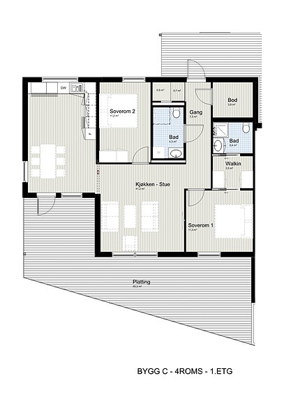Denne 3‑romsleiligheten leveres med store oppholdsrom. Her får du delvis separat stue- og kjøkkenløsning, Du får store soverom, hvorav det ene har eget bad og walk-in-garderobe. I tillegg har leiligheten romslig bod og en entré. Denne leiligheten passer godt for deg eller dere som ønsker en romslig leilighet med to bad og god garderobeplass.