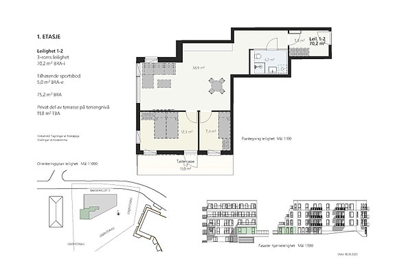 Alle arealer som er oppgitt i forbindelse med markedsføringen av prosjektet er beregnet basert på tegninger, er å betrakte som ca. areal, og det tas forbehold om mindre avvik fra det oppgitte. Arealet er gitt av utbygger og megler har ikke kontrollmålt arealene.