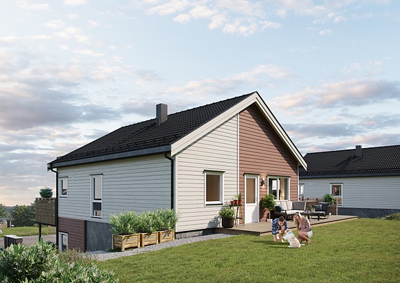 På motsatt side av boligen går du inn til en gang som fører deg til et soverom, et kontor og enda et bad. Fra gangen her, går du ut til en stor terrasse på ca. 31 m2 og egen hage. Det er satt av plass på tomten slik at du kan sette opp garasje selv etter overtagelse, om du ønsker dette.