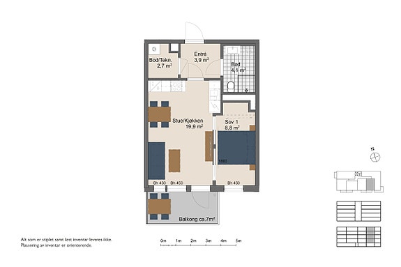- Fin stue-/kjøkkenløsning med utgang til balkong på 7 kvm