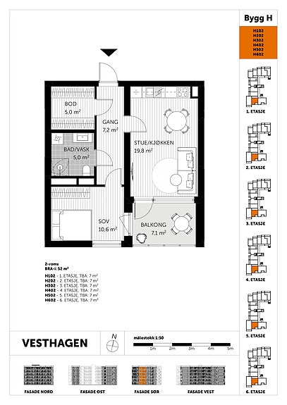 Vesthagen H - består av 72 leiligheter, fordelt over 6 etasjer. Vesthagen er planlagt solgt i flere salgstrinn, og planlegges oppført i to byggetrinn.