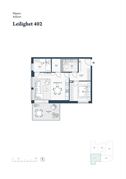 Arealet er beregnet ut fra Norsk standard NS 3940:2023. BRA-i: Internt arealet innenfor boligens omsluttende vegger, inkludert sjakt. BRA-e: Eksternt areal som boligen har eksklusiv bruksrett til, men som ikke ligger i boligen, f.eks. kjellerbod. BRA-b: Areal for innglasset balkong med veggareal. Total BRA = Summen av BRA-i, BRA-e og BRA-b. TBA er areal på terrasse og balkong. Arealet oppgis ved salg, men inngår ikke i BRA. Oppgitt romareal er netto romareal. De oppgitte arealer er å betrakte som cirka-arealer. Partene har ingen krav mot hverandre dersom arealet skulle vise seg å være 5 % mindre / større enn det oppgitte areal.