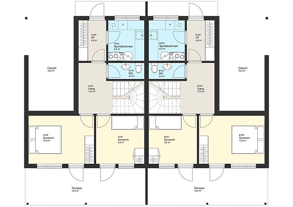 På eiendommen planlegges en vertikaldelt tomannsbolig med to romslige seksjoner. Begge enhetene får egen parkering i carport, på asfaltert parkeringsareal.