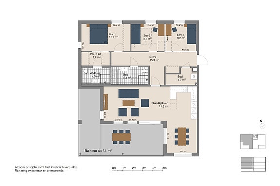 - Flere soner i stue-/kjøkkenområdet gir gode møbleringsmuligheter