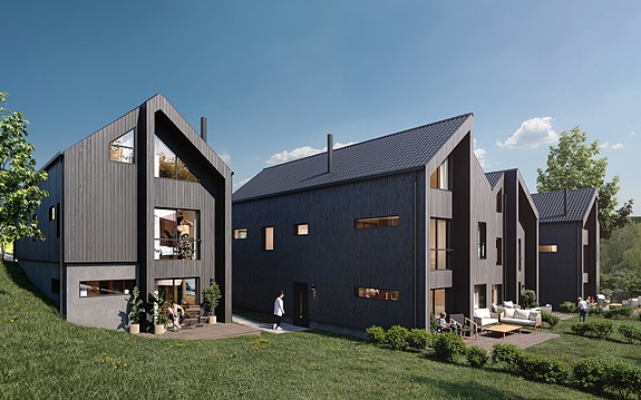 - Det tas forbehold om at illustrasjoner i tegninger og 3D i annonsen er kun ment som eksempler og kan vise forhold som ikke er i samsvar med leveranse. Dette kan være møblering, fargevalg, dør- og vindusform, antall vinduer, bygningsmessige detaljer, for eksempel fasadedetaljer, manglende inntegning av sjakter/innkassinger/rørføringer/dragere/søyler, detaljer på fellesarealer, detaljer på lekeapparater, materialvalg, beplantning etc. Omgivelsene rundt husene er manipulert.
