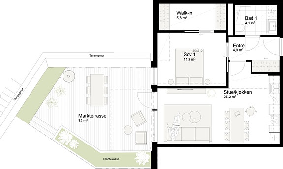 2-roms leilighet med åpne stue- og kjøkkenløsning med store vindusflater. Fra stue/kjøkken har du utgang til stor markterrasse. Delikat flisbelagt bad med plass til vaskemaskin. Du kan velge mellom tre ulike interiørkonsepter kostnadsfritt. Alle 3- og 4-roms leiligheter kan kjøpe èn (1) p-plass av kr 490 000.