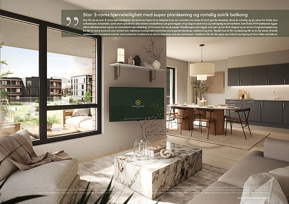 Her får du en stor 3-roms hjørneleilighet. Du kommer hjem til en leilighet hvor du i entréen har plass til stort garderobeskap. Stua er romslig og gir plass for både stor sofaseksjon, lenestoler, samt stort spisebord. Den ekstra vindusflaten på gavlveggen vil gi deg en ekstra lys og behagelig boatmosfære. Det flotte HTH kjøkkenet ligger delvis tilbaketrukket og har en innholdsrik hjørneløsning. Ut fra stua har du skyvedør til balkongen som ligger mot sør og har flott dagsol og en smart innglassingsløsning. Du får to store soverom som enkelt kan møbleres funksjonelt med både store garderobeskap, nattbord og mer. Badet har en fin romløsning slik at du får plass til både vaskemaskin og tørketrommel, samt plass for å sette inn et ekstra høyskap ved servantskapet. I kjelleren får du din egne sportsbod og tilgang til stor felles sykkelbod.