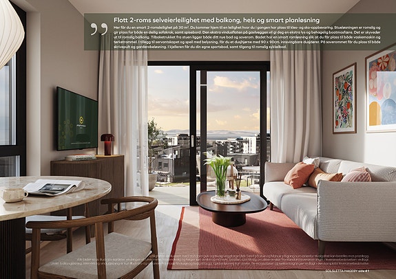 Her får du en smart 2-romsleilighet på 30 m2. Du kommer hjem til en leilighet hvor du i gangen har plass til kles- og sko-oppbevaring. Stueløsningen er romslig og gir plass for både en deilig sofakrok, samt spisebord. Den ekstra vindusflaten på gavlveggen vil gi deg en ekstra lys og behagelig boatmosfære. Det er skyvedør ut til romslig balkong. Tilbaketrukket fra stuen ligger både ditt nye bad og soverom. Badet har en smart romløsning slik at du får plass til både vaskemaskin og tørketrommel. I tillegg til servantskapet og speil med belysning, får du et dusjhjørne med 90 x 90cm. innsvingbare dusjdører. På soverommet får du plass til både skrivepult og garderobeløsning. I kjelleren får du din egne sportsbod, samt tilgang til romslig sykkelbod.