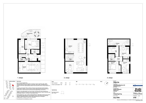Boligene går over tre plan tre eller fire soverom. Hovedplanet vil bestå av stue og kjøkken, toppetasjen vil bestå av tre soverom og bad. Inngangsplan består av gang, stue/soverom og bad bod/vaskerom. Fra parkeringen vil det være en sluse rett inn til boligen med enkel og praktisk tilgang til og fra bilen.