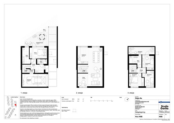 Boligene går over tre plan tre eller fire soverom. Hovedplanet vil bestå av stue og kjøkken, toppetasjen vil bestå av tre soverom og bad. Inngangsplan består av gang, stue/soverom og bad bod/vaskerom. Fra parkeringen vil det være en sluse rett inn til boligen med enkel og praktisk tilgang til og fra bilen.