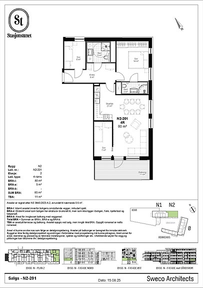 Arealet er beregnet ut fra Norsk standard NS 3940:2023. BRA-i: Internt arealet innenfor boligens omsluttende vegger, inkludert sjakt. BRA-e: Eksternt areal som boligen har eksklusiv bruksrett til, men som ikke ligger i boligen, f.eks. kjellerbod. BRA-b: Areal for innglasset balkong med veggareal. Total BRA = Summen av BRA-i, BRA-e og BRA-b. TBA er areal på terrasse og balkong. Arealet oppgis ved salg, men inngår ikke i BRA. Oppgitt romareal er netto romareal. De oppgitte arealer er å betrakte som cirka-arealer. Partene har ingen krav mot hverandre dersom arealet skulle vise seg å være 5 % mindre / større enn det oppgitte areal.