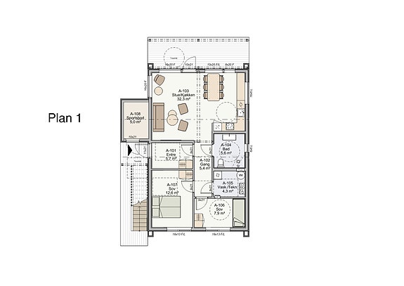 • Romslige utplasser i begge etasjer.