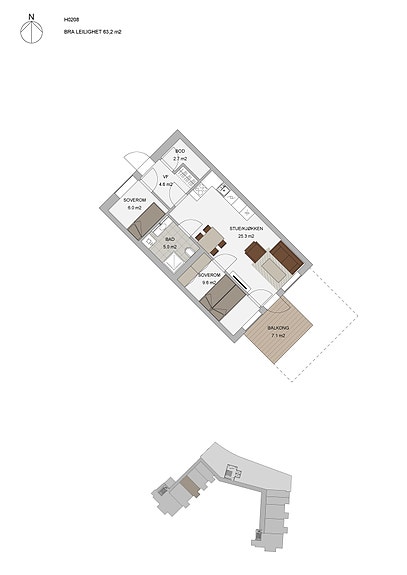 Nå har du muligheten å sikre deg en splitter ny leilighet med en sentral beliggenhet i Alta sentrum og samtidig med en flott utsikt over Altadalen. Boligdelen i B8-prosjektet består av 40 moderne leiligheter som har gangavstand til alt av sentrumsfasiliteter. Fra din egen balkong kan du nyte nordlysets magiske dans på vinterhimmelen, og når solen endelig vender tilbake etter mørketiden i januar, er dette en av de første tomtene i Alta hvor solen skinner. Leilighetene er plassert i plan 2, 3, 4 og 5 i et kombinasjonsbygg med næring - hvorav flere av leilighetene i 2.etasje disponerer hver sin romslige terrasseplatt. Boligene er i fem ulike størrelser, og spenner fra smarte 2-roms til romslige 4-roms enheter, alle med moderne planløsninger som kombinerer funksjonalitet og estetikk. De største leilighetene vil også ha mulighet som tilvalg for en egen hybel, som kan gi gode ekstrainntekter. Leilighetene har innglasset balkong.