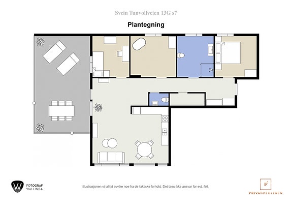 Vedlagte plantegninger er ikke målbare, og oppgitte arealer er hentet fra vedlagt tilstandsrapport. Arealene er plassmålt og beregnet med utgangspunkt i NS 3940:2023.