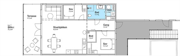 Endeleilighet i andre etasje, som inneholder: Entré, to soverom, baderom med eget vaskerom, bod, stue med åpen kjøkkenløsning og utgang til flott terrasse på 17,3 kvm. I tillegg følger utvendig sportsbod. Leiligheten har mulighet for et tredje soverom
