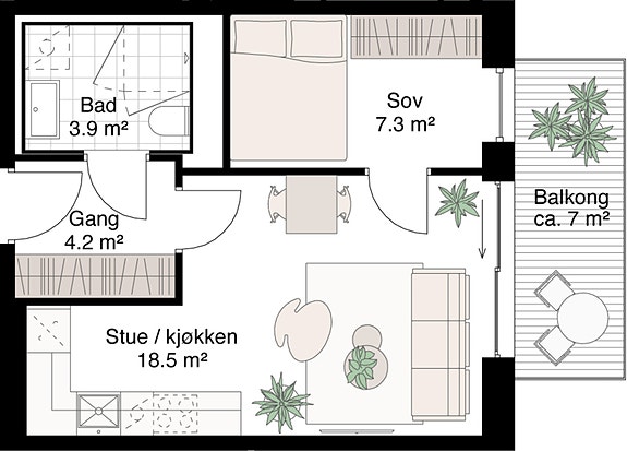 Lys og fin 2-roms leilighet med åpne stue- og kjøkkenløsning med store vindusflater. Fra stue/kjøkken har du skyvedør ut til romslig balkong. Delikat flisbelagt bad med plass til vaskemaskin. Du kan velge mellom tre ulike kjøkkenkonsepter/modeller kostnadsfritt.
