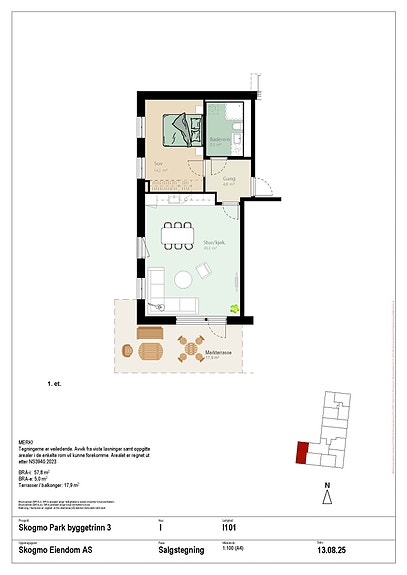 All informasjon er gitt med forbehold om rett for utbygger til å foreta mindre endringer. Det må påregnes mindre justeringer i forbindelse med endelig prosjektering og opparbeidelse av eiendommen. Nedforinger, dragere, søyler og innkassinger i himling må påregnes.