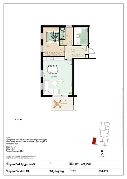 All informasjon er gitt med forbehold om rett for utbygger til å foreta mindre endringer. Det må påregnes mindre justeringer i forbindelse med endelig prosjektering og opparbeidelse av eiendommen. Nedforinger, dragere, søyler og innkassinger i himling må påregnes.