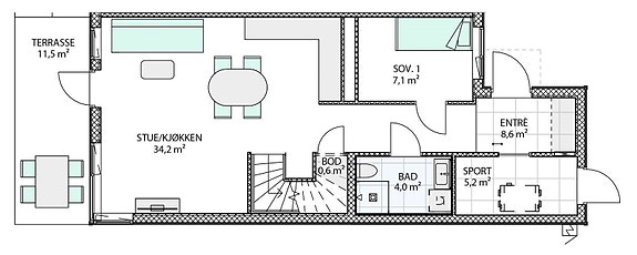 • etasje består av stue og kjøkken med utgang til terrasse, kombinert bad/vaskerom, soverom, innvendig bod og entre