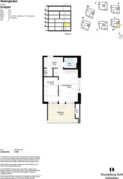 Inntegnet utstyr/inventar som er stiplet medfølger ikke. Generelle beskrivelser av prosjektet i salgs-og markedsføringsmateriell vil ikke passe for alle enhetene. Kjøper oppfordres særskilt til å vurdere solforhold, utsikt og beliggenhet i forhold til terreng og omkringliggende eksisterende og fremtidig bygningsmasse mv. før et eventuelt bud inngis. Det kan være avvik mellom de planskisser, planløsninger, og tegninger som er presentert i prosjektet, og den endelige leveransen. Dersom det er avvik mellom tegninger i prospekt/Internettside og leveransebeskrivelsen i den endelige kontrakt med kjøper, vil leveransebeskrivelsen ha forrang og omfanget av leveransen er begrenset til denne. Vindusplassering i den enkelte bolig kan avvike noe fra de generelle planer, som følge av bl. a. den arkitektoniske utformingen av byggene.