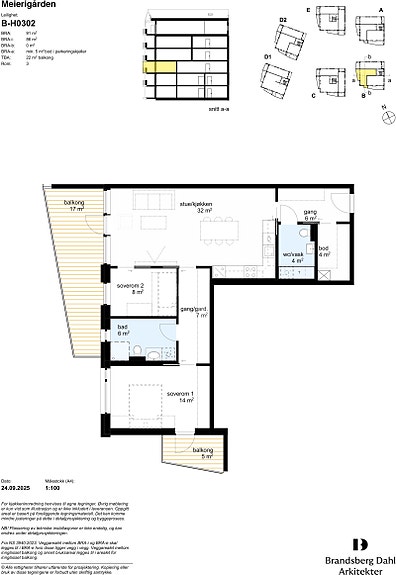 Inntegnet utstyr/inventar som er stiplet medfølger ikke. Generelle beskrivelser av prosjektet i salgs-og markedsføringsmateriell vil ikke passe for alle enhetene. Kjøper oppfordres særskilt til å vurdere solforhold, utsikt og beliggenhet i forhold til terreng og omkringliggende eksisterende og fremtidig bygningsmasse mv. før et eventuelt bud inngis. Det kan være avvik mellom de planskisser, planløsninger, og tegninger som er presentert i prosjektet, og den endelige leveransen. Dersom det er avvik mellom tegninger i prospekt/Internettside og leveransebeskrivelsen i den endelige kontrakt med kjøper, vil leveransebeskrivelsen ha forrang og omfanget av leveransen er begrenset til denne. Vindusplassering i den enkelte bolig kan avvike noe fra de generelle planer, som følge av bl. a. den arkitektoniske utformingen av byggene.