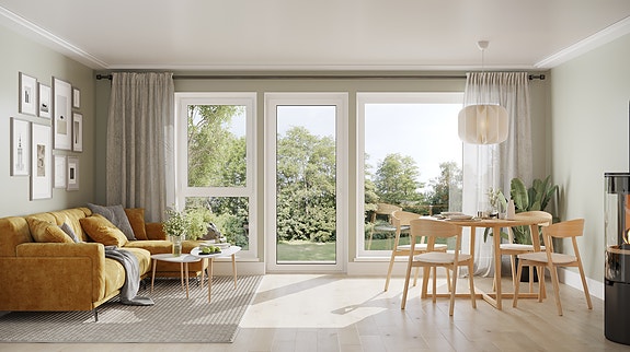 I stuen skaper gulvet fra Kährs, Luxury Tiles sammen med Smartpanel Trend Lys Sand på veggene et lyst og stilrent preg. De store vinduene fyller rommet med naturlig lys og gir en lun og trivelig atmosfære – perfekt for både rolige kvelder og hyggelige sammenkomster.