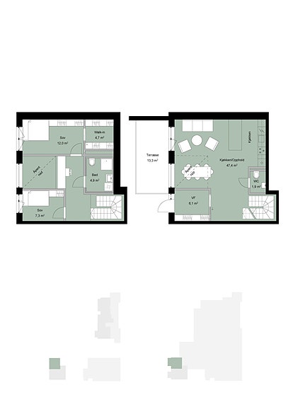 2-roms leilighetene har en arealeffektiv og funksjonell planløsning, og inneholder:
