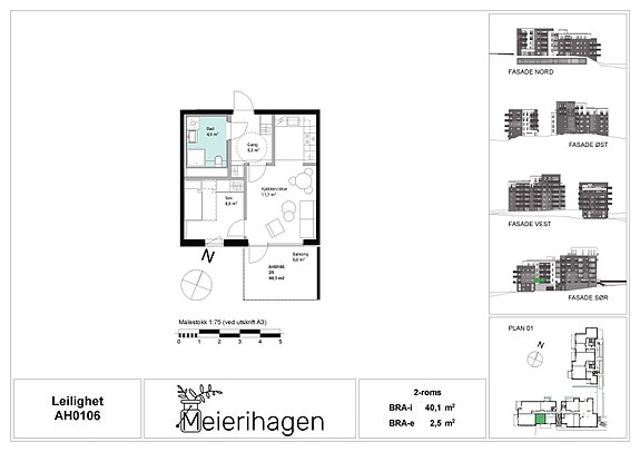 Meieihagen består av totalt 76 leiligheter fordelt over 3 bygg. Bygg A1, A2 og B.