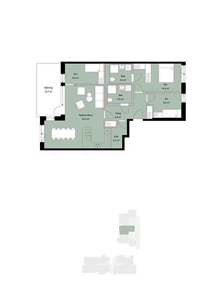 3-roms leilighetene passer godt for unge par eller små familier, og inneholder: