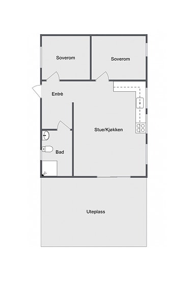 Leiligheten ligger i 1. etasje mot øst og inneholder gang, 2 soverom, bad, samt stue og kjøkken i åpen løsning med utgang til uteplass.