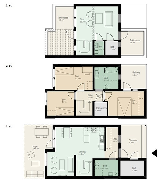 Boligene får tre soverom, to baderom og eget gjestetoalett - en gjennomtenkt planløsning som passer like godt for familier som for par eller dem som ønsker ekstra rom til hjemmekontor. I tillegg leveres boligene med både hovedstue og loftstue. Loftstuen har direkte utgang til to lekre takterrasser på ca. 7,8 og 15 kvm som gir svært gode solforhold.