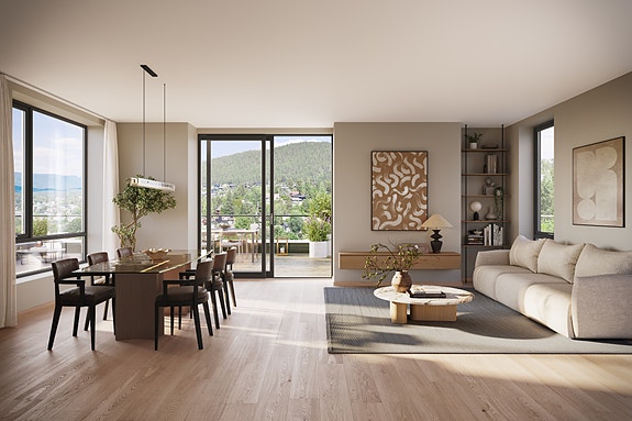Stue med utgang til stor takterrasse m.ed fantastisk utsikt og kveldssol