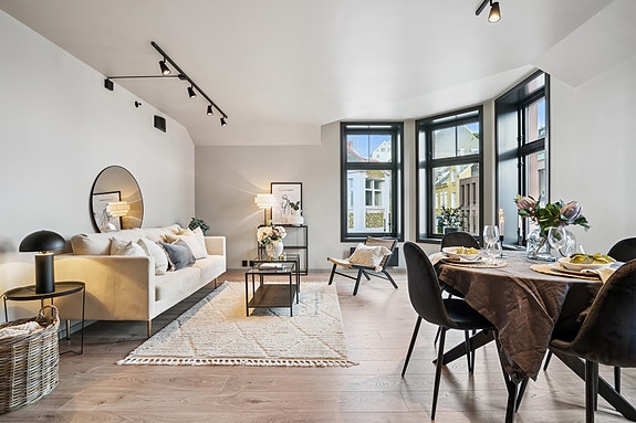 Leiligheten er en del av prosjektet i Kirkegata 3, hvor den ærverdige bygården har blitt satt til liv igjen og i dag huser ti nyrenoverte eierseksjoner og en næringsseksjon.
