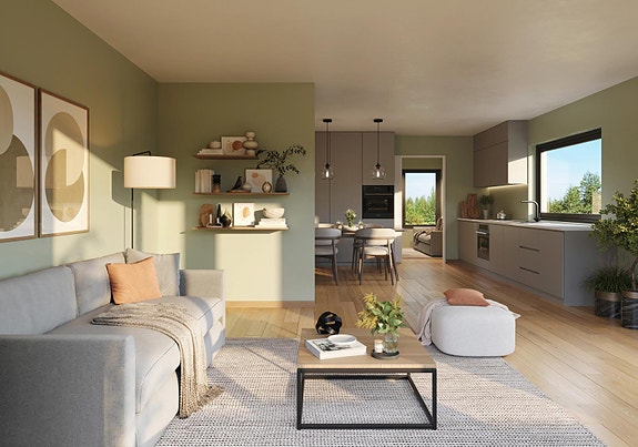 Boligene holder en moderne og gjennomgående god standard med parkettgulv i oppholdsrom og soverom, gipskledde vegger og himlinger samt slette innerdører. Åpen stue- og kjøkkenløsning gir gode lysforhold og fleksible møbleringsmuligheter. Hver bolig får privat terrasse med levegg, carport og egen sportsbod. Utvendig leveres boligene med royalimpregnert kledning og løsninger som gir lavt vedlikeholdsbehov.