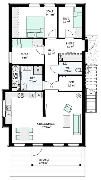 Fra den romslige entréen har du direkte inngang til et av soverommene. Videre inn er hallen, og herfra kommer du til enda to soverom, en innvendig bod, et gjestetoalett og et romslig bad. 4-romsleilighetene har en delvis åpen stue- og kjøkkenløsning, her er det gode muligheter for ulik innredning i stuedelen. Det følger med sportsbod og én parkering i carport på alle 4-roms leilighetene.