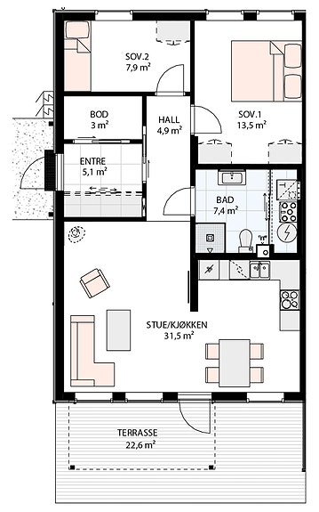 Her er det direkte inngang fra entréen inn til en praktisk innvendig bod - med gode muligheter for oppbevaring av ekstra klær og sko. Fra hallen innenfor entréen går du inn til badet og to romslige soverom. Stue- og kjøkkenrommet har god plass til både sofa og spisebord. Kjøkkenet er praktisk plassert i det ene hjørnet av rommet. Fra stuen er det utgang til enten balkong eller terrasse. Alle får sportsbod, noen av 3-roms leilighetene får carport, og andre får parkeringsplass.