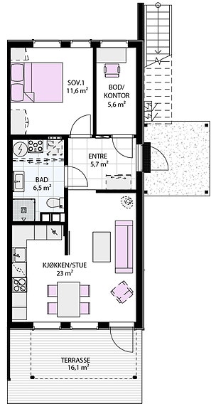 1 etasje: Velger du en bolig i første etasje, får du en romslig terrasse, samt eget hageområde med ferdigplen. I tillegg får du 60x60 fliser med gulvvarme i entréen.