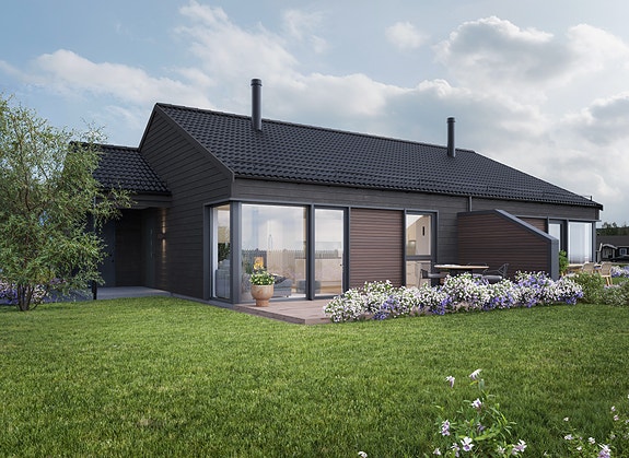 - Utvendig kledning leveres fabrikkgrunnet og malt ett toppstrøk