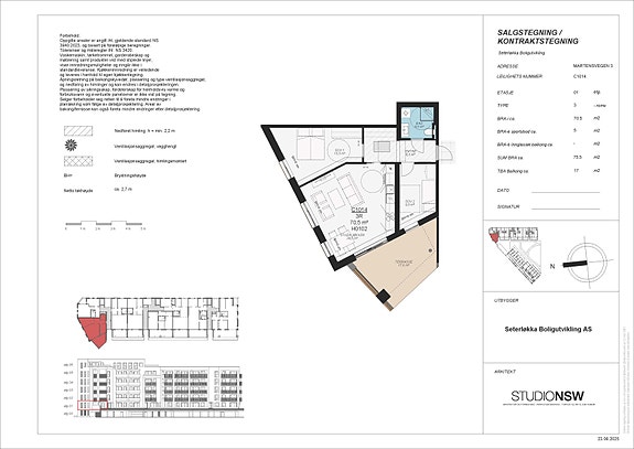 Det blir utstedt energiattest for den enkelte leilighet. Boligens varmetap og energibehov er dimensjonert iht. teknisk forskrift av 2017, TEK 17. Energimerkingen er beregnet til å ligge i kategori A til B. Det tas forbehold for at avvik kan forekomme spesielt i leiligheter med mye vindusflate.
